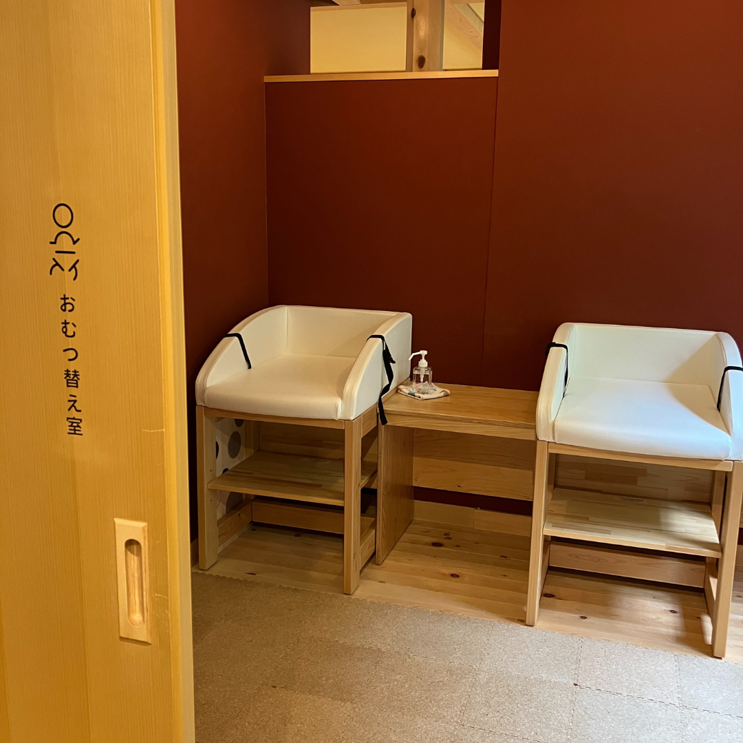 「おもちゃのやかた」内の「赤ちゃん木育ひろば」入り口にございます。また、「であいのやかた」のだれでもトイレ内、女性用トイレ内に、おむつ替え用のベビーシートがございます。