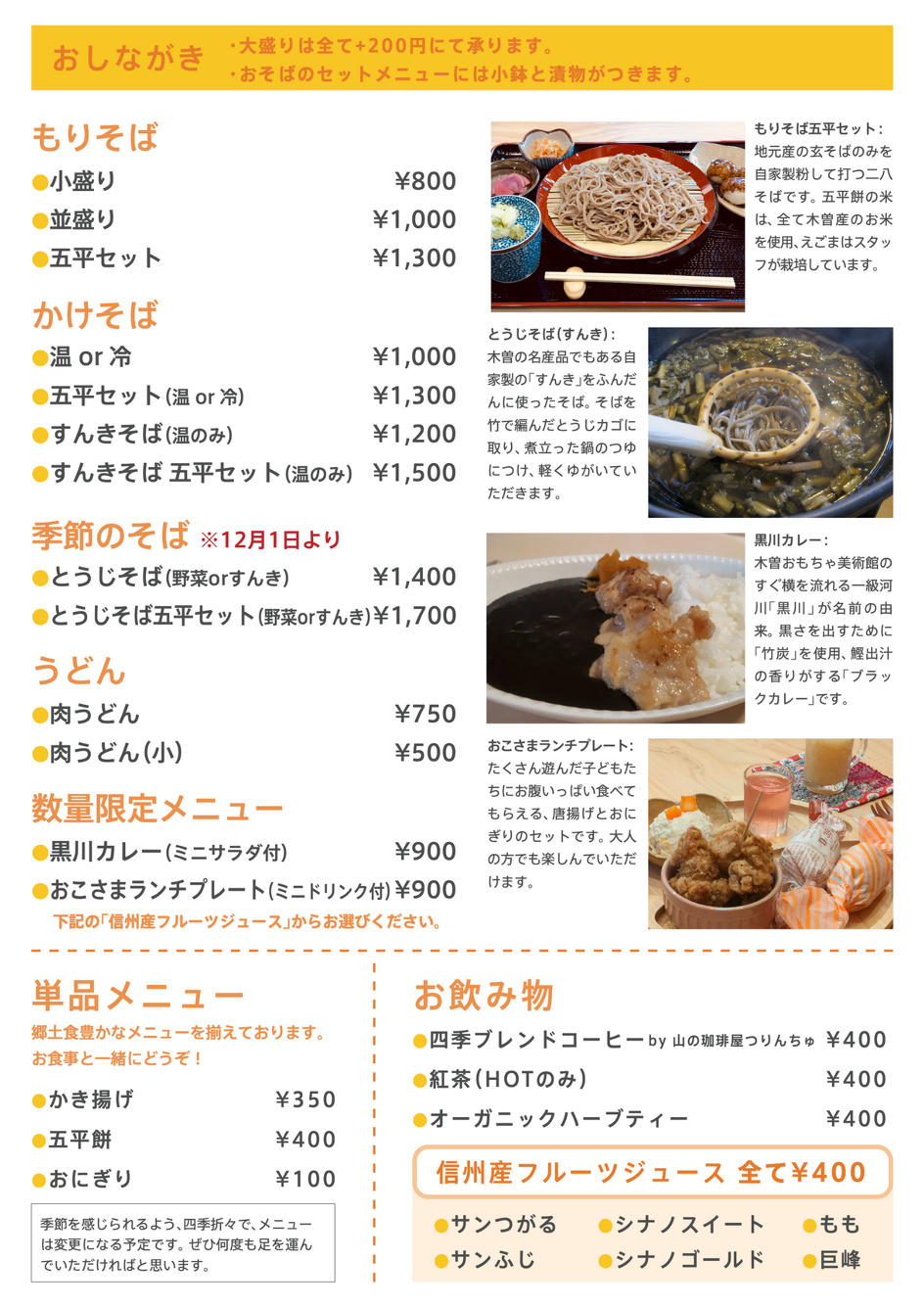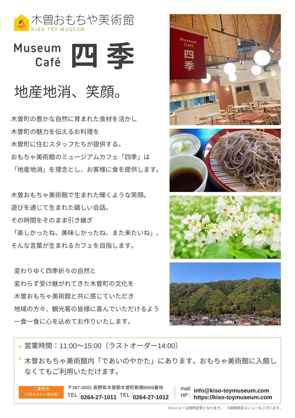 Based on the principle of local production and consumption, we make generous use of ingredients grown in the rich natural environment of Kiso Town.