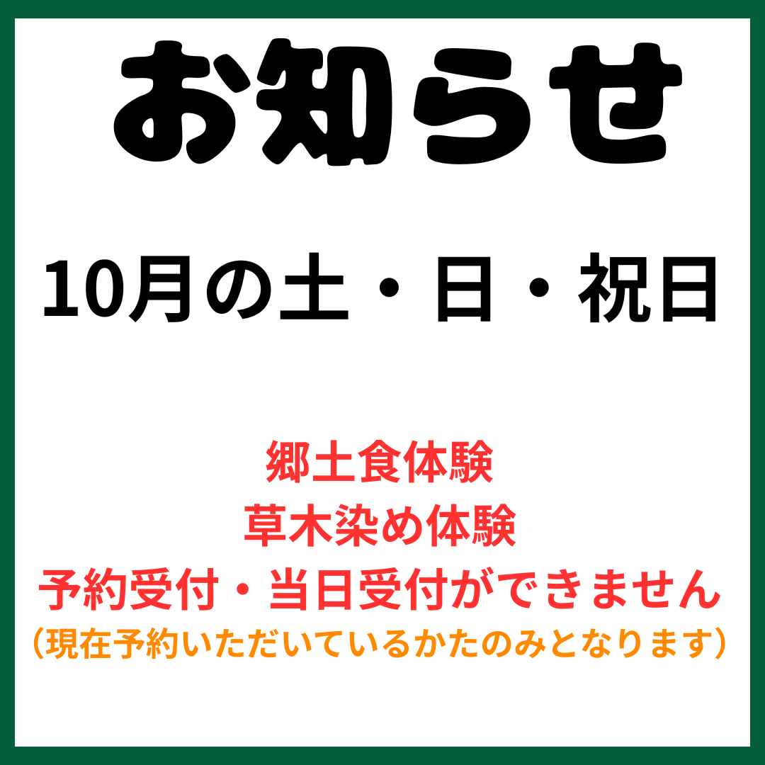 10月 郷土食体験・草木染体験・に関しまして予約の受け付けと当日の受付が不可能にな…